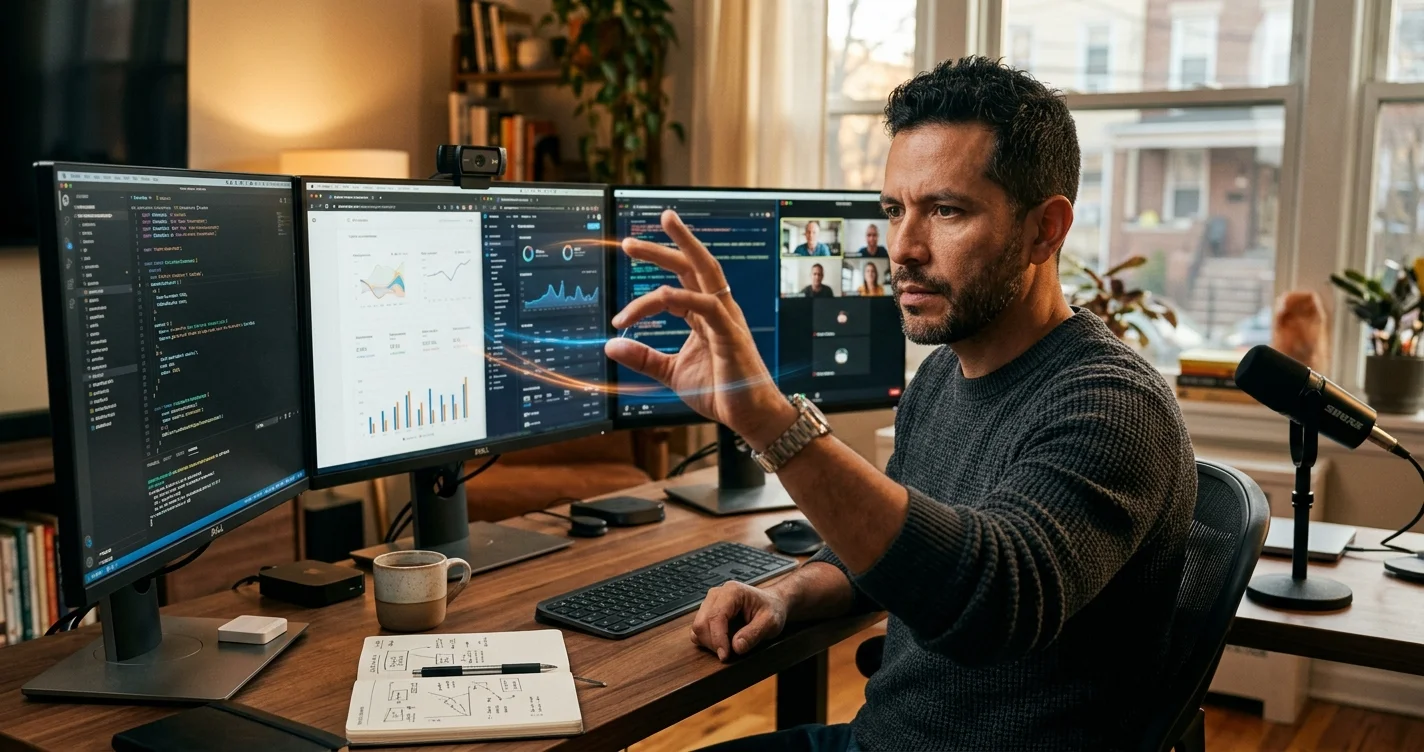 El día empezó viendo un video de un repo en GitHub. Termina con una computadora que responde a gestos en tres pantallas, entiende comandos de voz en español, busca cosas en internet cuando le pregunto, y me lee las respuestas en voz natural.